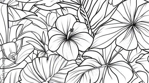hibiscus, floral, pattern, tropical, seamless, leaf, design, textile, print, background, flower, white, black, nature, summer, illustration, art, graphic, botanical, wallpaper, fabric, texture, line, vignetting, outline, vector, image, style, plant, blossom, bloom, elegance, beauty, decoration, ornament, repeat, vintage, retro, modern, abstract, monochrome, drawing, ink