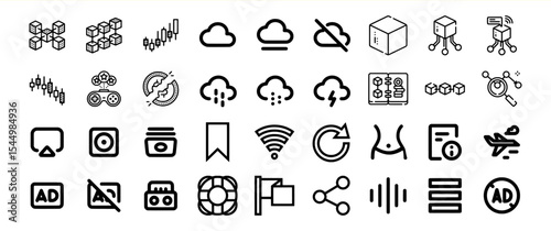 icon, black, white, bundle, datum, cloud, network, technology, symbol, cyberspace, wi-fi, computer, digital, communication, information, security, storage, advertising, advertisement, media, gaming, travel, weather, bookmark, refresh, menu, analysis, graphic, design element, vector, line art, simple, minimal