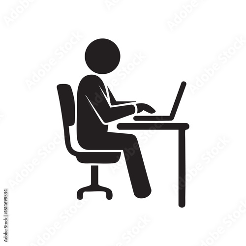 icon, person, man, woman, sitting, desk, table, laptop, computer, typing, working, office, business, technology, digital, communication, online, education, study, learning, freelance, home office, graphic, illustration, symbol, silhouette, black-and-white, simple, clean, minimalist, design element, vector, isolated, white background, creative, concept, web design, datum, information, keyboard, screen