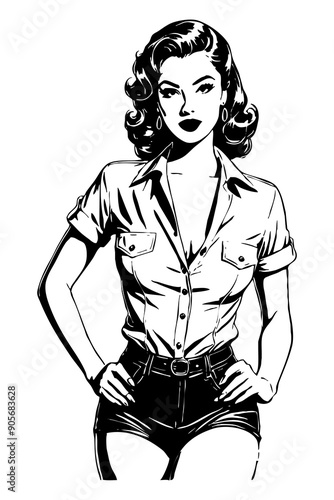 Black and white illustration. Fictional female character in the Pin Up style. Generated by Ai