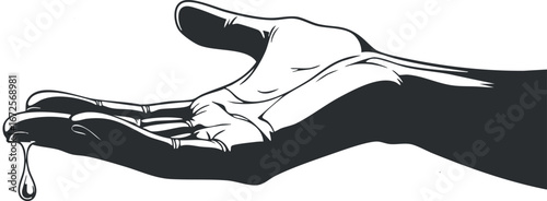Black and white illustration of a human hand with a single drop of liquid falling from the fingertips