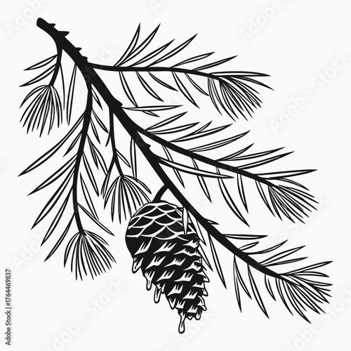 pine cone, pine tree, tree branch, evergreen, conifer, nature, forest, winter, christmas, seasonal, botanical, plant, illustration, drawing, vignetting, vector, silhouette, black-and-white, monochrome, isolated, white background, graphic, design, element, decoration, ornament, resin, sap, dripping, sticky, natural, organic, timberland, wildlife, season, holiday, pine needle, foliage, leaf, cone, seed, growth, life, beauty, detail, texture, art, stylised