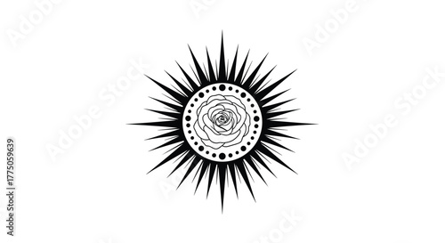 Black and white illustration of a rose flower centered in a dotted circle with radiating sharp sun rays, creating a mystical and elegant symbol.