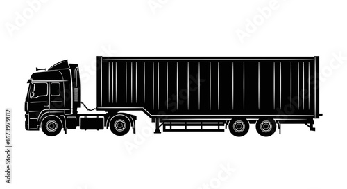truck, vehicle, transportation, container, trailer, semi, freight, shipping, cargo, delivery, logistic, transport, commerce, industry, commercial, road, automobile, automotive, haulage, distribution, export, import, trade, business, silhouette, black, white, illustration, graphic, design, drawing, outline, isolated, side, view, profile, machine, heavy, duty, engine, cab, wheel, tire, axle, chassis, metal, steel, line, stripes