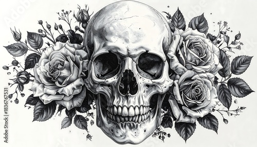 skull, rose, flower, death, life, beauty, monochrome, flower petals, bloom, thorn, grey, white, detail, intricate, gothic, romantic, delicate, organic, floral, elegant, design, skeleton, artistry, illustration, drawing, realism, still, art, dark, light