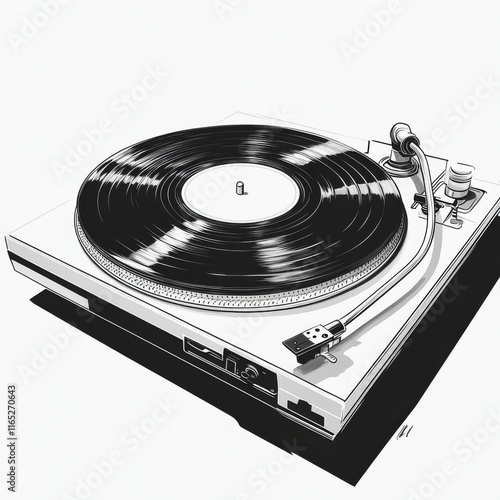 turntable, vinyl, record, music, analog, audio, sound, player, disc, black, white, illustration, drawing, vignetting, design, graphic, art, retro, vintage, classic, technology, style, image, picture, photo, object, equipment, device, machine, instrument, entertainment, collection, listen, spin, groove, needle, tonearm, platter, album, single, song, melody, rythm, beat, dance, party, nostalgia, past, history