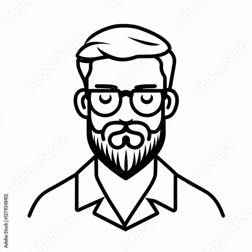 Black and white line art icon of a scientist with a short beard and moustache for science-related designs.