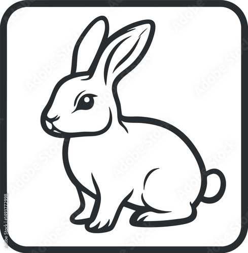 Black and white line art illustration of a rabbit sitting with upright ears in a simple square frame
