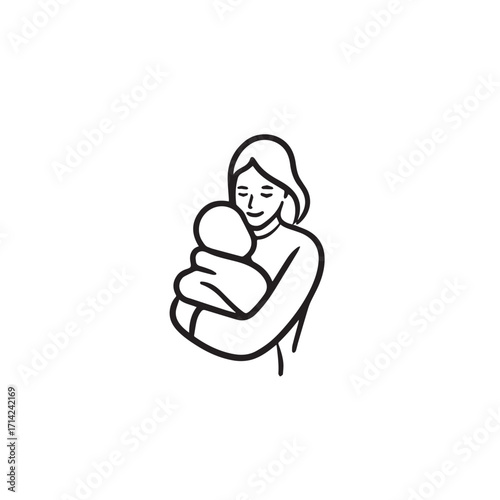 Black and white line art of a beautiful mother lovingly embracing her baby minimalist tender illustration