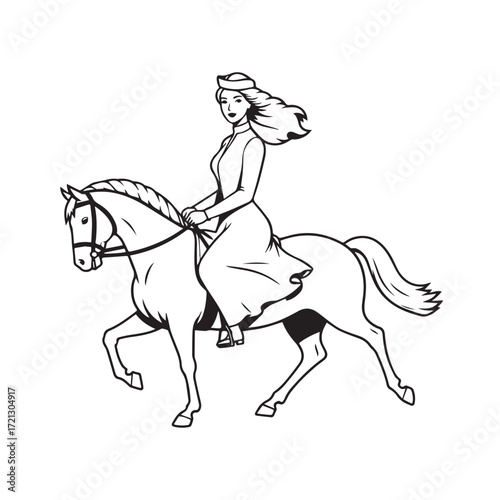 woman, horse, riding, equestrian, beautiful, body, elegant, stylish, outfit, vector, illustration, line art, black, white, drawing, vignetting, outline, silhouette, graceful, confident, minimal, minimalist, simple, chic, fashion, strong, female, rider, horseback, lifestyle, graphic, design, modern, artwork, aesthetic, decorative, posh, posture, athletic, feminine, contemporary, sport, leisure, stable, countryside, charming, equine, composition