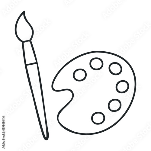 Black and white line drawing of artistic paintbrush and palette icon. Vector illustration