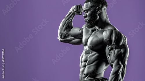black and white male fitness model with lean muscle making a bold pose on a violet background