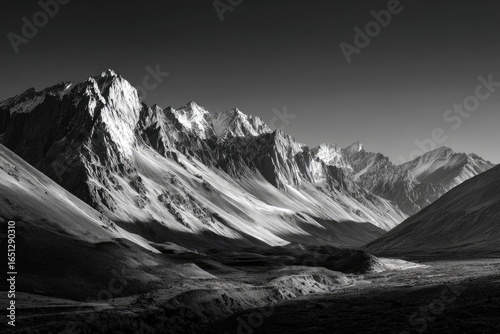 mountain, range, snowy, peak, vale, light, shadow, dramatic, landscape, monochrome, serene, huge, majestic, rugged, winter, cliff, alpine, nature, elevation, cold, high, scenic, photo, black, white, shadow, contrast, dark, sunlit, granite, rock, texture, detailed, view, panorama, silhouette, powerful, stunning, beauty, sharp, grandeur, imposing, glacial, icy, exposure, glacé, photographic, breathtaking