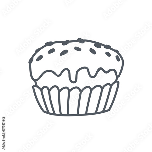 Black and white outline drawing of cupcake in simple doodle style. American pastry dessert. Flat vector monochrome icon isolated on white background.