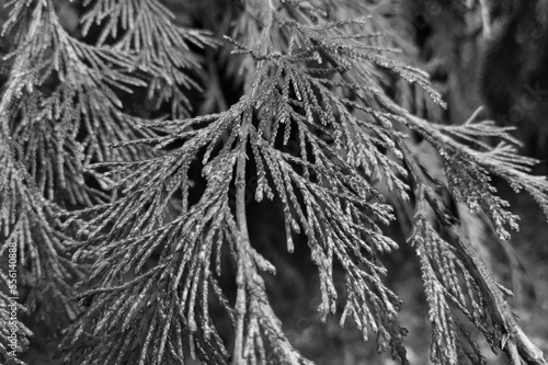 Black and white photo. A branch of thuja in the park. The background of nature.