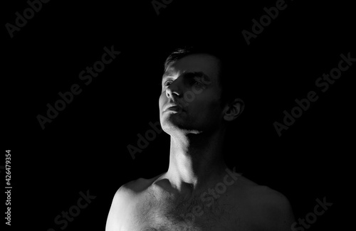 face, portrait, dramatic, black, expression, human, man, dark, head, guy, male, adult, person, light, serious, white, shadow, emotion, people, photo, facial, confident, young, closeup, profile, attractive, 1