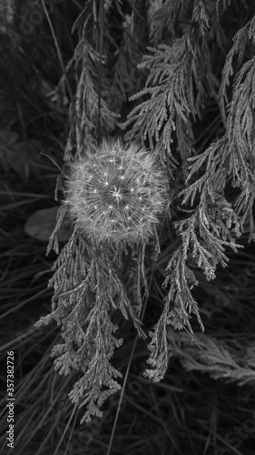 Black and white picture of a dandelion flower in grass. Soft focus. Nature background.