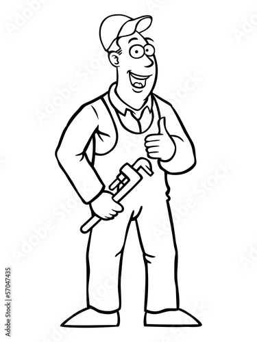 man, guy, person, male, people, plumber, plumbing, profession, occupation, repairman, maintenance, workwear, repairing, professional, mechanic, tool, wrench, overall, clothing, cap, baseball cap, holding, thumb, thumb up, gesture, approval, ok, acceptance, success, good, smiling, friendly, fun, happy, happiness, emotion, cheerful, casual attire, clothes, cartoon, illustration, drawing, vector, black, white, black-and-white