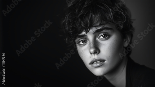 portrait, black-and-white, young person, closeup, monochrome, face, beauty, emotion, timeless, soft focus, curly hair, studio shot, elegant, sophisticated, cinematic, serene, mysterious, contemplative, greyscale, natural beauty, minimalist, introspective, soulful