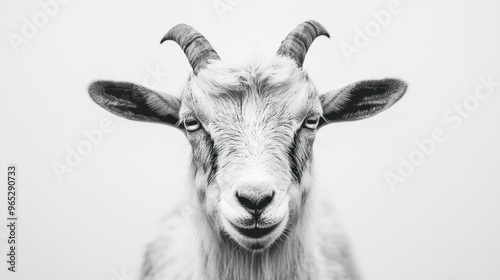 goat, animal, mammal, farm, horn, white, black, portrait, face, eye, nose, mouth, fur, closeup, monochrome, photo, nature, wildlife, farm animal, domestic, curious, cute, adorable, friendly, gentle, peaceful, calm, innocence, stare, looking, gazing, head, ear, whisker, background, simple, minimal, clean, sharp, sharpened