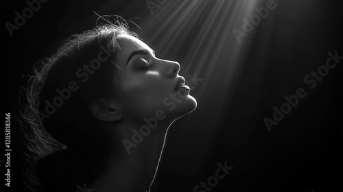 Black and white profile portrait of a young woman bathed in rays of light on a dark background. Horizontally.