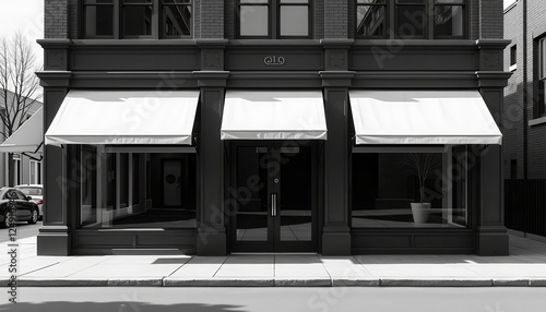 Black and White Rendered Building with Awnings and City Street Scene