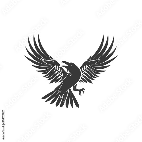 black, white, silhouette, flying, raven, crow, bird, wing, widener, outstretched, feather, beak, talon, claw, wildlife, nature, animal, avian, fauna, dark, light, contrast, graphic, design, logotype