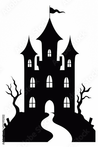 Black and white silhouette of castle with door.
