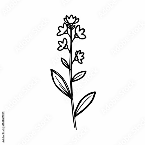 Black and white sketch of a flower with leaves isolated on white
