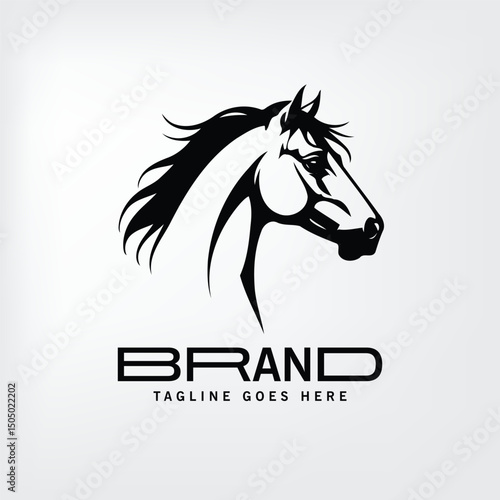 Black and white stylized horse head logo design in a modern aesthetic. Elegant profile view of a horse head, a powerful, abstract graphic.