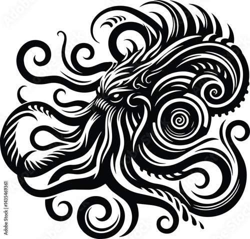 black-and-white, vector, silhouette, tribal art, pattern, tentacle, ocean, depth, marin, monster