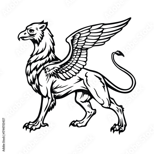 griffin, engraving, illustration, vector, monochrome, black-and-white, vintage, vignetting, hand-drawn, line art, detailed, isolated, white background, art, artwork, graphic, design, print, classic, antique, fantasy, mythology, legendary, beast, griffin, chimera, eagle, lion, hybrid, heraldry, symbol, power, strength, majesty, fiction, zoology, drawing, ink, hatching, monster, ancient, mediaeval, blazonry, wing, wing, myth