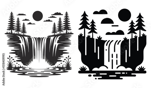 waterfall, silhouette, nature, landscape, sun, moon, pine, tree, forest, vector, illustration, black, white, monochrome, adventure, wilderness, circular, emblem, logotype, icon, graphic, design, scene, scenic, water, cascade, wood, celestial, sky, travel, park, environment, eco, tranquil, peaceful, rock, cliff, splash, river, stream, beauty, art, symbol, badge, print, isolated, day, night