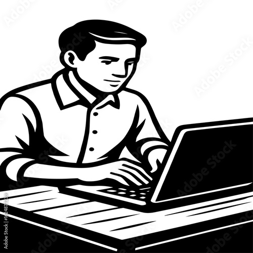 man working, laptop, desk, black-and-white, typing, computer, technology, productivity, freelance, home office, business, professional, graphic art, high contrast, workspace, table, monochrome, concentration