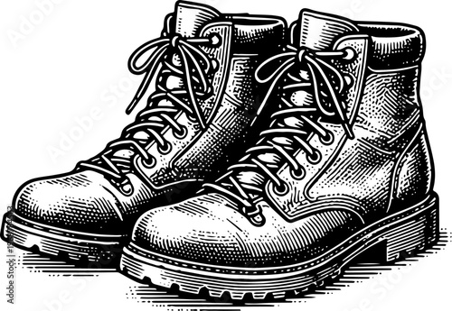 Black and White Vintage Pair of Rugged Hiking Boots Vector Illustration for Outdoor Adventure Designs