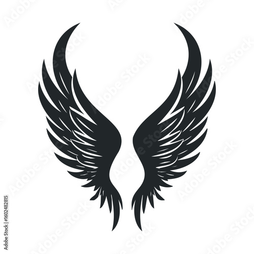 black, angel, wing, tattoo, design, silhouette, feather, abstract, decorative, spiritual, mythical, illustration, emblem, elegant, aethereal, flight, artistic, graphic, symbol, fantasy, avian, imaginative, graceful, symmetry, icon, winged, celestial, heavenly, ornament