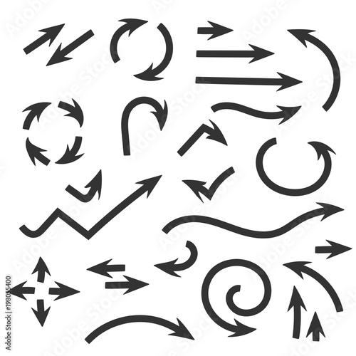 arrow, flat, set, white, black, icon, curve, arrow, pen, collection, drawing, vector, doodle, hand, design, direction, graphic, illustration, isolated, symbol, right, down, up, pointer, line, element, web, signs, cursor, abstract, shape, digital, drawn