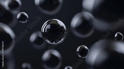 Black background, floating black shiny balls. Shiny banner, 3D scene effect, modern macro photorealistic abstract background. The generation of AI