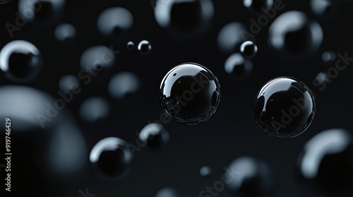 Black background, floating black shiny balls. Shiny banner, 3D scene effect, modern macro photorealistic abstract background. The generation of AI