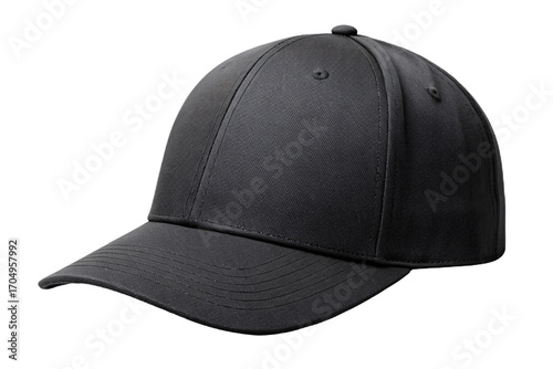 Black baseball cap with structured front panels and curved visor, classic sports headwear, isolated on a transparent background