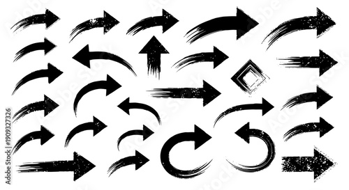 Black brush stroke arrows pointing various directions on white background for design and graphics