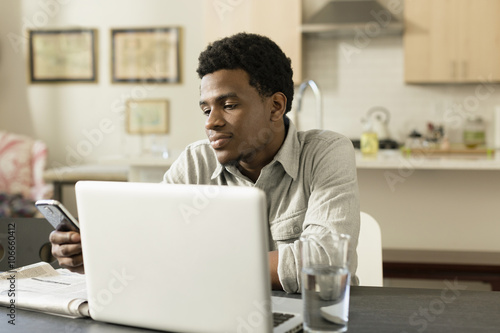 affluence, answering, apartment, black, breakfast, businessman, candid, mobile phone, closeup, color image, communication, dialling, domestic life, electronic mail, electronic mail, ethnicity, home office, cyberspace, laptop, luxury, man, mobile phone, multitask, newspaper, one person, online, people, portrait, reading, real people, receiving, selective focus, sending, table, technology, text messaging, texting, us, virginia, wireless technology, working, young adult