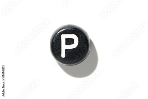 Black button with white letter p isolated on white background with shadow creating bold contrast and minimalist design