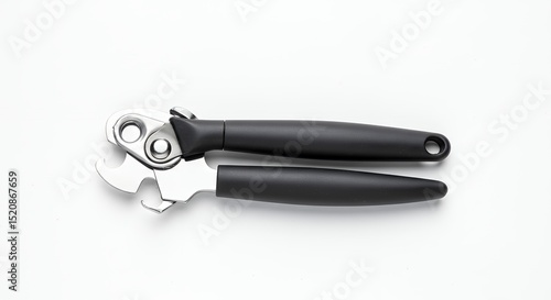 can opener, opener, can, tool, black, metal, plastic, handle, object, household, utility, equipment, isolated, bright, simple, food, preparation, white background, overhead, home, cooking, accessory, kitchen, image, photo, copy space