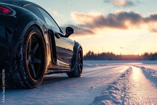 Black Car with Winter Tires on Snowy Road at Sunset. AI generated illustration