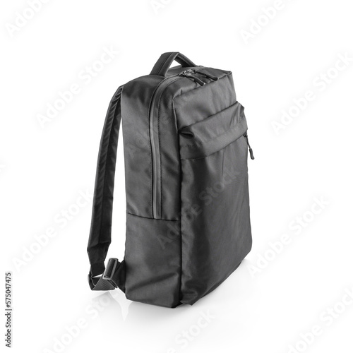 Black casual backpack in white background. Fabric rucksack with zip compartments. Side view.