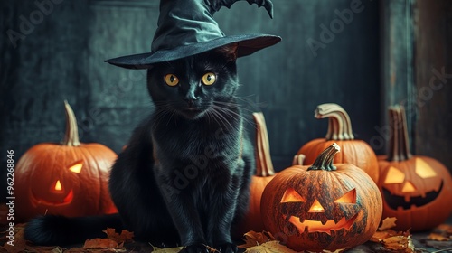 halloween, cat, pumpkin, vector, black, illustration, autumn, holiday, cartoon, sorcerer, bat, orange, hat, moon, night, celebration, october, animal, cute, horror, scarey, dark, skittish, kitten, lantern