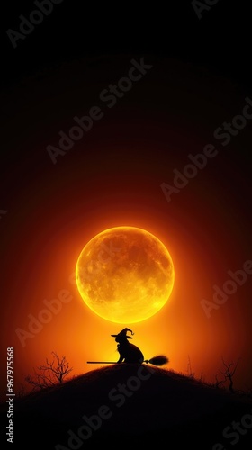 Black cat dressed as a witch, sitting on a broomstick under the full moon, witch cat, spooky Halloween pet