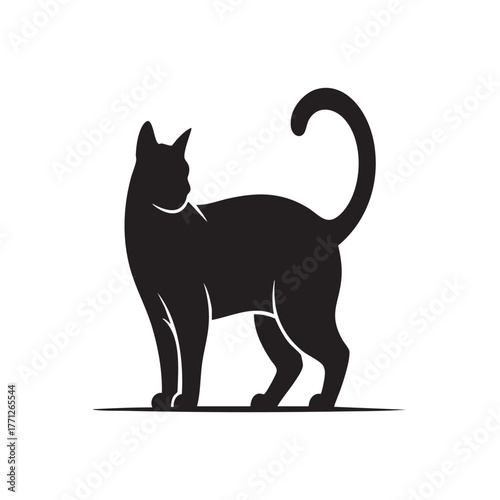 cat, black cat, silhouette, animal, pet, domestic cat, standing, tail, elegant, graceful, simple, clean, graphic, vector, icon, logotype, isolated, white background, minimal, felino, mammal, creature, outline, stylised