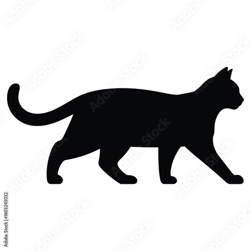 cat, silhouette, animal, pet, felino, mammal, domestic, walking, moving, profile, side, view, black, isolated, white, background, simple, graphic, icon, vector, creature, legged, tail, paw, ear, whisker, graceful, elegant